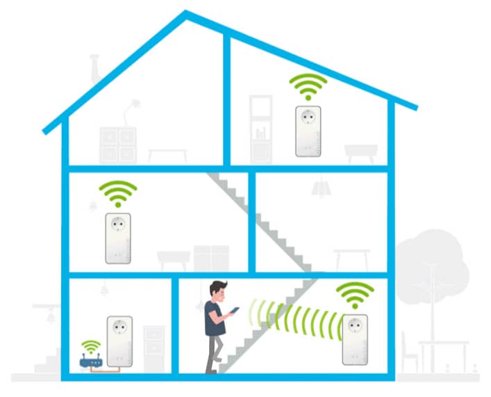In many Wi-Fi networks, end devices independently determine which network they connect to. Older smartphones, tablets and similar devices in particular stick to their Wi-Fi access point (e.g., router, devolo device) until the signal cuts off – only then do they switch to the Wi-Fi access point with better reception. Access Point Steering speeds up this process.