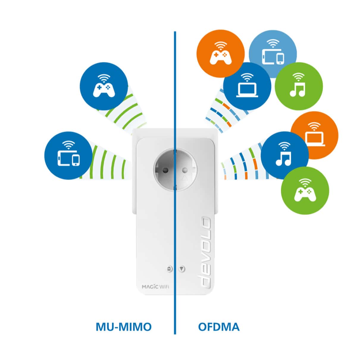 While MU-MIMO adds further „lanes“ to the wireless data highway and thus enables simultaneous coverage of multiple end devices, OFDMA offers the most effective transport of data packets through flexible use of these lanes – for even more end devices. When the Wi-Fi network is used in parallel by many end devices, this leads to optimised data throughput without noticeable latencies.